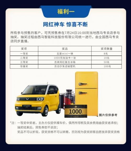 只要是购买了我们预售券的客户,都可以参与我们的抽奖活动,我们的大奖是网红神车五菱mini,一共给大家提供了8辆。当然,除了我们的大奖五菱mini外,我们还有1000元加油卡、志高网红复古冰箱、苏泊尔破壁机。