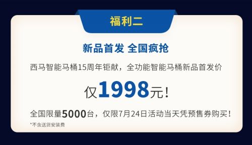 西马智能马桶15周年距献,全功能智能马桶新品只需1998元,全国限量5000台。