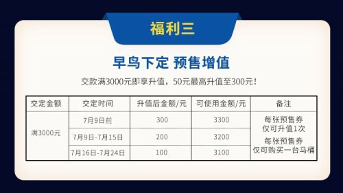 早鸟下定,预售增值。凡是购买了我们预售券的客户,只要消费满3000,均可以享受预售券增值,50元最高增值至300元。