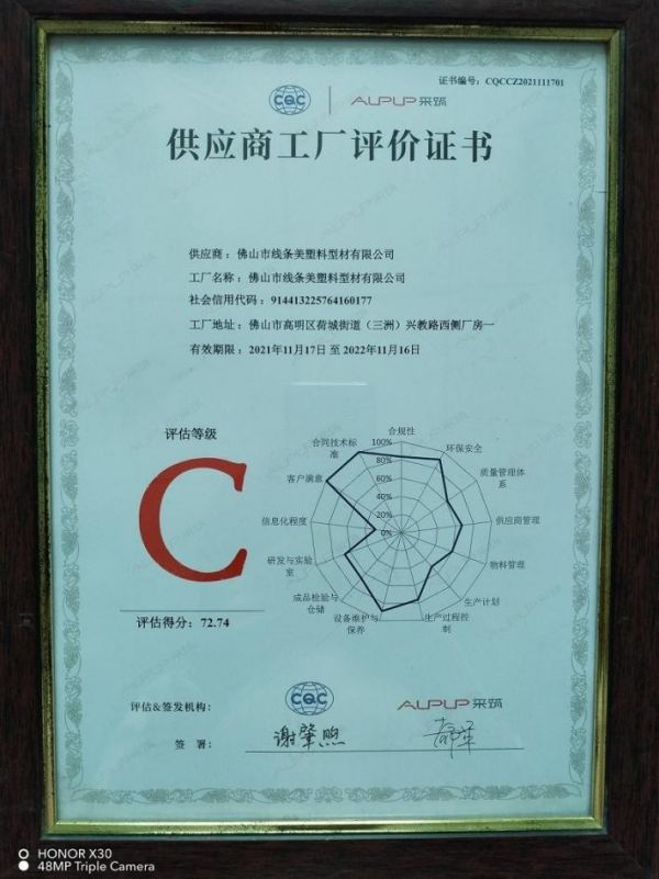 线条美以“诚信团结,求实创新”的标准时刻激励自己,树立踢脚线行业民族品牌,争创“踢脚线”中国实力品牌。目前产品通过ISO9000国际质量管理体系认证,建立和完善了全面质量管理体系,大力推行完整、科学的质量管理体系,让产品设计和品质到达国际水平之列。目前线条美已取得多项发明专利,外观专利和实用新型专利。