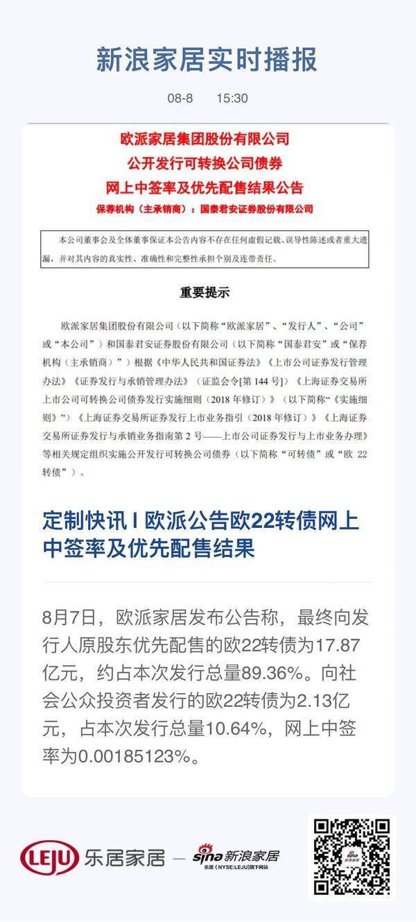 新浪定制频道讯 8月7日,欧派家居发布公告称,最终向发行人原股东优先配售的欧22转债为17.87亿元,约占本次发行总量89.36%。向社会公众投资者发行的欧22转债为2.13亿元,占本次发行总量10.64%,网上中签率为0.00185123%。