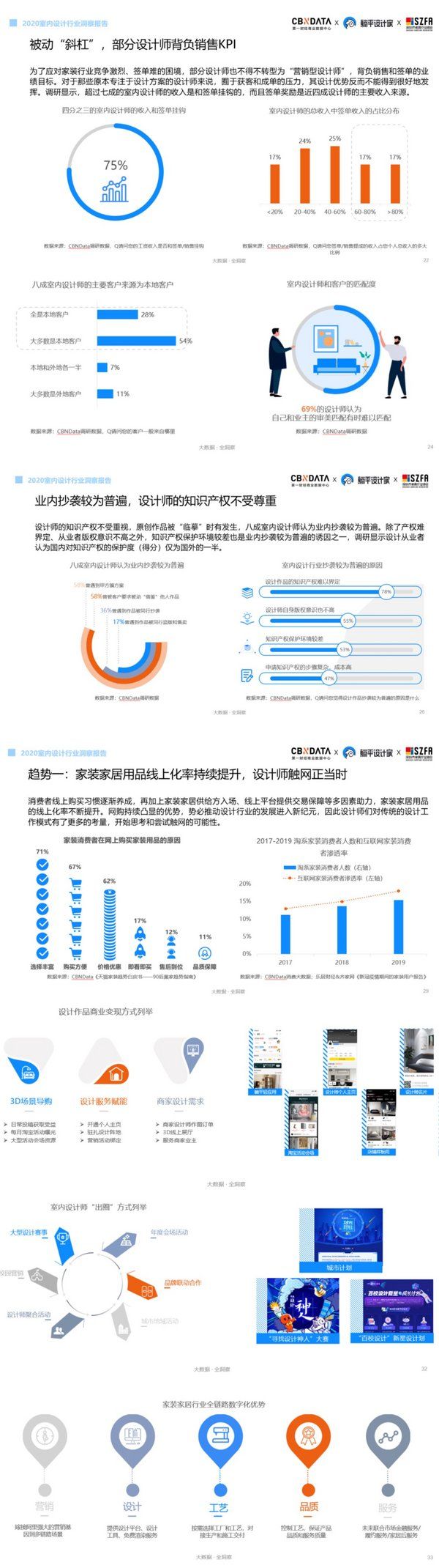 除了能“文”会“武”,在获客难、签单慢、竞争极其激烈的家装行业,部分设计师还背负着销售的KPI,不得不被迫兼职“销售”。CBNData《报告》显示,有三成公司每成功获得 1个成单客户背后要至少接触 6个以上潜在客户。其中,超过七成的室内设计师的收入与签单率直接挂钩,签单奖励也是近四成设计师的主要收入来源。