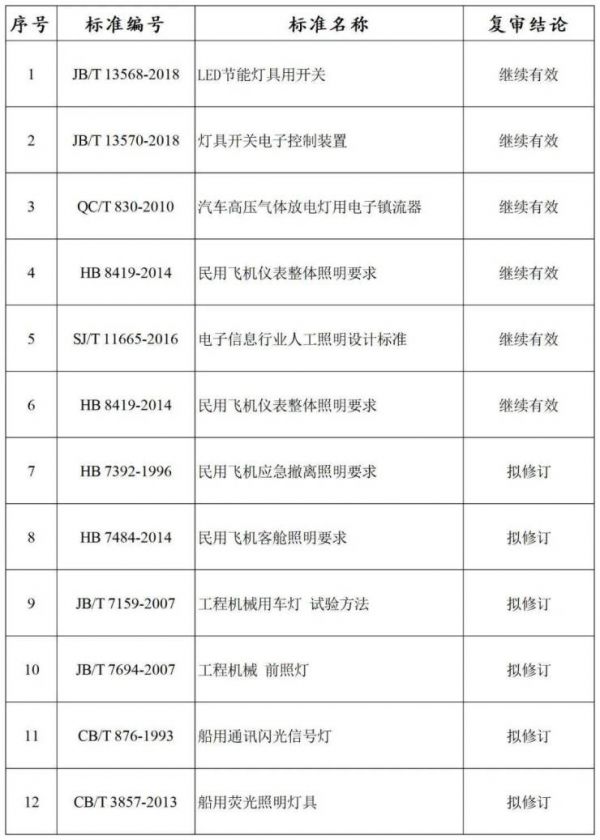 经相关行业协会、标准化技术组织的评审,现拟定轻工等16个行业,共4194项行业标准复审结论,其中包括12项照明相关行业标准,“LED节能灯具用开关”、“灯具开关电子控制装置”、“汽车高压气体放电灯用电子镇流器”、“民用飞机仪表整体照明要求”、“电子信息行业人工照明设计标准、“民用飞机仪表整体照明要求”等6项标准继续有效,“民用飞机应急撤离照明要求”、“民用飞机客舱照明要求”、“工程机械用车灯 试验方法”、“工程机械 前照灯”、“船用通讯闪光信号灯”、“船用荧光照明灯具”等6项标准拟修订。