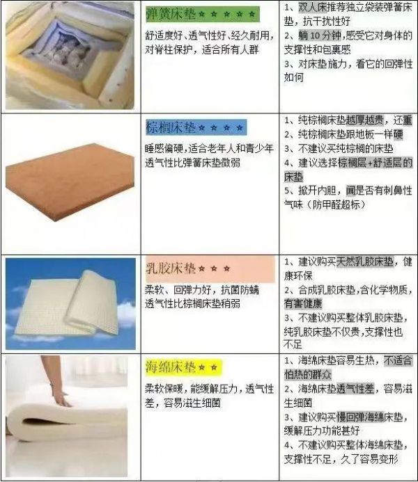 选择床垫,健康环保非常重要,朝夕相伴的东西,马虎不得。然后就是选择床垫类型,弹簧床垫、棕榈床垫、乳胶床垫、海绵床垫,它们各有利弊,小编整理了一张图,方便大家快速对比了解!