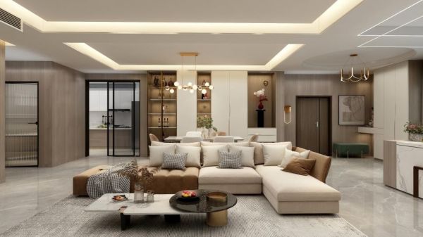 以层次与结构作为思考基础,有屋智能将不同元素在空间里铺陈开来,通过不同色彩及材质的灵活运用,让沙发、墙面、地面从色彩搭配上形成统一的画面,让看似简洁的空间,氤氲出优雅的格调。同时结合独特的灯光设计,让客厅空间呈现出浪漫的时光氛围,让生活的仪式在这里被无限放大,恣意享受简奢生活带来的美好瞬间。