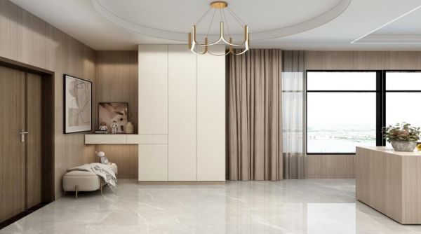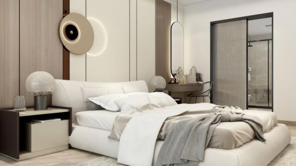 卧室是睡眠及休息的重要场所,也是最需要人性化设计的地方。有屋智能整体以中性色调为主,搭配柔和的米色软装,使人平静、安稳,从颜色和材质的细节上舒缓情绪,将实用性和美观性发挥到了极致,保持了空间的连贯性。背景墙线条造型与两侧床头柜结合,拉高了空间层次感,简约的设计,不仅让空间过度更自然,亦兼具了装饰的时尚性与实用性。