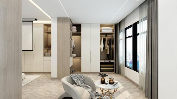 步入式衣帽间的设计,让私密生活尽在掌握。智能橱柜精灵,24小时恒温杀菌、防潮、防霉、除螨,让衣物享受最理想的保养时光。