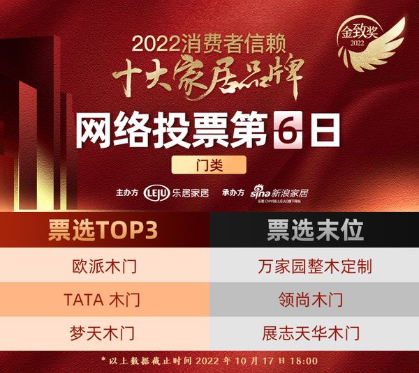 票选DAY6 | 「门类」品牌,欧派木门蝉联榜首,TATA木门与梦天木门分列二三位