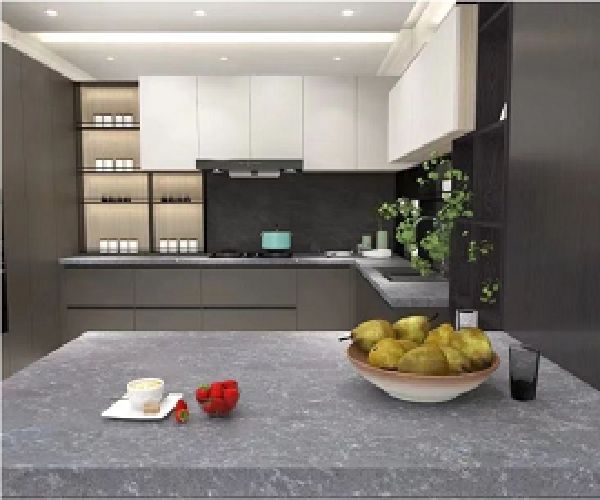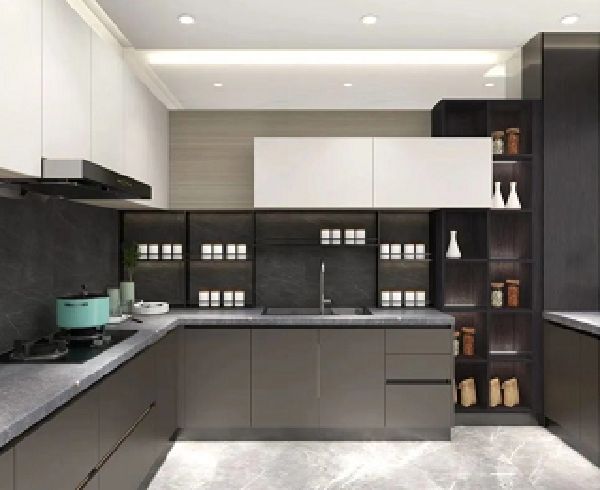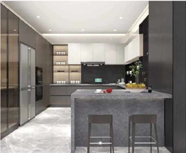 整体使用带有时尚科技感的灰白配色,打造简约大气的西式轻奢风格。表面采用进口花色的三胺纸和进口哑光涂料工艺,更加抗污、耐高温;搭配烟灰色石英石台面,不仅统一了厨房的整体格调,而且耐剐蹭,节省日常打理时间。