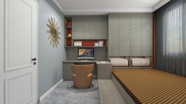 简约的书桌,搭配兼具收纳展示于一体的柜体,在简约自然的空间营造出一种时尚优雅的氛围。