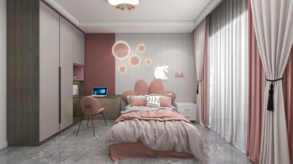 温馨的儿童房,满足孩子一切所需。极具艺术氛围的吊灯跳脱在空间内,与简约的衣柜融为一体,让空间氛围显得优雅奢华且富有格调。