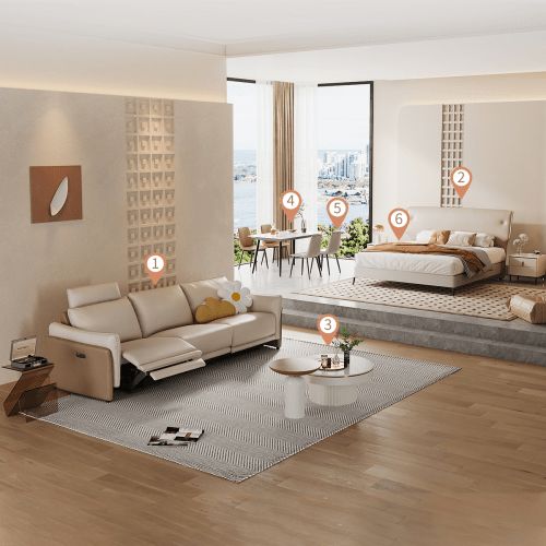 其中,50611B客餐厅套系包含50611B真皮功能沙发、PT072茶几电视柜组合、PT072餐桌椅,整体呈现典雅轻奢、明亮大气的风格。功能沙发采用巴西进口头层牛皮材质,承载顺畅的无极调节系统,可在110°-160°间随心变换躺平角度;茶几电视柜组合用料考究,具有6大封闭收纳空间,实用又美观;伸缩式圆餐桌,大小自由切换,既能满足日常所需,也可大方宴客,餐椅采用分段式软包靠背,落座十分舒适。
