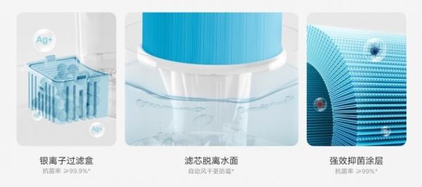 除了加湿技术的迭代,米家纯净式智能加湿器还在水路和滤芯上做足功夫,内置双重有效抗菌系统层层递进,银离子过滤盒——强效抑菌涂层——自动风干式悬浮滤芯,有效减少霉菌异味,银离子抗菌率更是高达 99.9%。