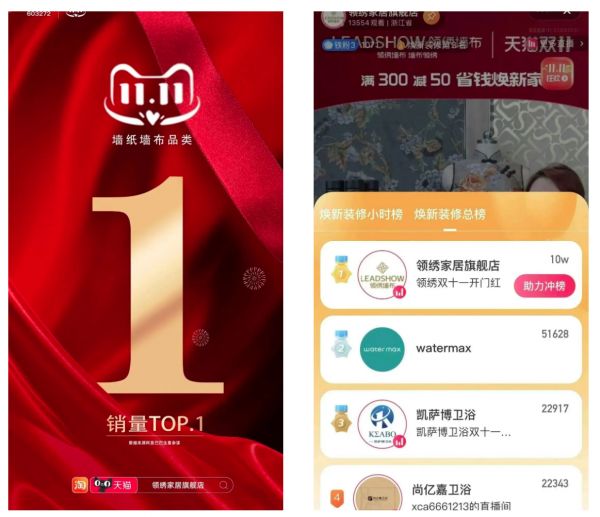 11月11日,伴随零点钟声敲响,领绣双十一以天猫焕新装修榜榜一、天猫双十一墙纸墙布品类总销量第一、抖音平台分时段流量3000+等诸多荣誉圆满收官!随着企业战报陆续出炉,可以看到在传统流量趋于见顶叠加疫情的背景下,市场在一定程度上呈现出消费活力复苏、消费结构转型升级的新趋势。领绣以多方位的营销策略为抓手,凭借品牌力加持和全链路数字化赋能,夺得亮眼成绩。从一个个“销量第一”的背后,我们看到了领绣主动求变的姿态,通过对高品质产品投放,差异化供给挖掘消费新增量,成就了其在各个头部平台霸榜“C位”的实力。