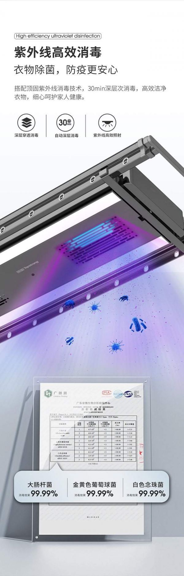 考虑到南方的天气大多数是潮湿的,在没有充足阳光晾晒的日子里,潮湿的衣服比较容易滋生细菌,而老人和小孩的抵抗能力差,更容易受到空气中细菌、病毒的伤害,利用高科技进行杀菌消毒势在必行。被称为晾衣神器的顶固D7系列离线语音晾衣机,采用紫外线杀菌消毒,能有效杀灭衣物里的霉菌等微生物,杀菌率高达99.9%,效果媲美阳光,就像在阳台筑起了一道天然的屏障,让肌肤远离霉菌伤害,给家人阳光般的自然健康呵护!