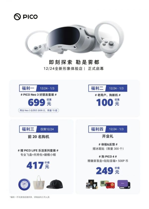 除此之外,PICO推出重磅优惠回馈新老用户。活动当天购机前20名的用户,可获赠价值417元的PICO LIFE 乐活系列套装。同时,在12月24日-1月3日期间到店体验和购买PICO 4 的用户都有机会获得精美礼品,更有好友购机和老用户购新机多重优惠等着大家。