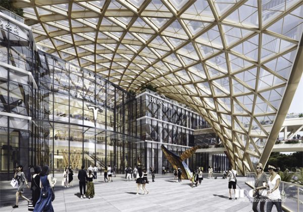 经谨慎研究,设计以玉帛造型化解原三角地形特有的环境冲突,多曲面的立体穹顶网架,使项目成为金融城高塔丛中的鸟瞰视觉中心。建筑商业空间采取街区式构成,中央与交通功能形成城市广场,既保证商业建筑空间凝聚感,也为交通疏散留足场地空间。