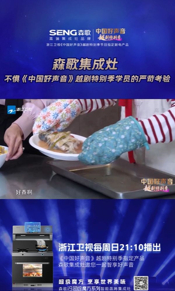 《中国好声音》越剧特别季自开播以来的收视和话题热度持续攀升,直播累计观看人次达9000万+,节目长视频累计播放量1.4亿+,全网短视频累计播放量达1.25亿+,微博话题阅读量累积3亿,累计全网热搜60个。越来越多消费者在聆听、欣赏越剧好声音,同时,森歌“理想厨房”的品牌声量也一浪高过一浪,备受观众朋友好评!