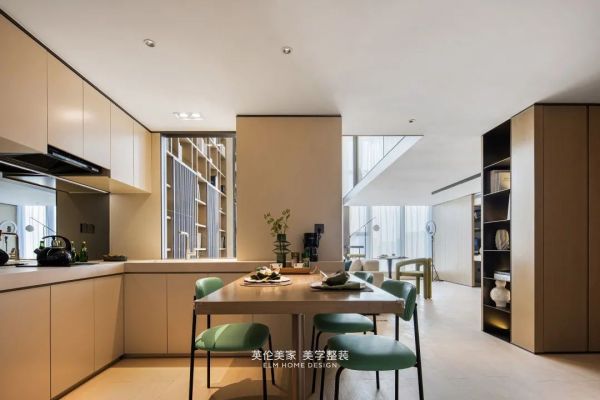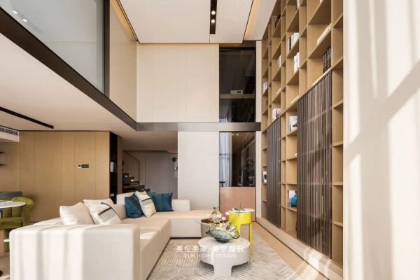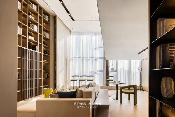 大面积落地窗将光与景自然的漫进空间与木质书架辉映。融入生活,光与影成为家中最好的风景。