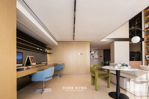 在一天当中,有三分一的时间处于工作状态。设计师希望打造轻松愉快的工作环境,使用蓝色点缀,借助色彩在感官、精神内涵层面引发美的感受;让室内空间承载功能性事物同时,更满足心理的需求。