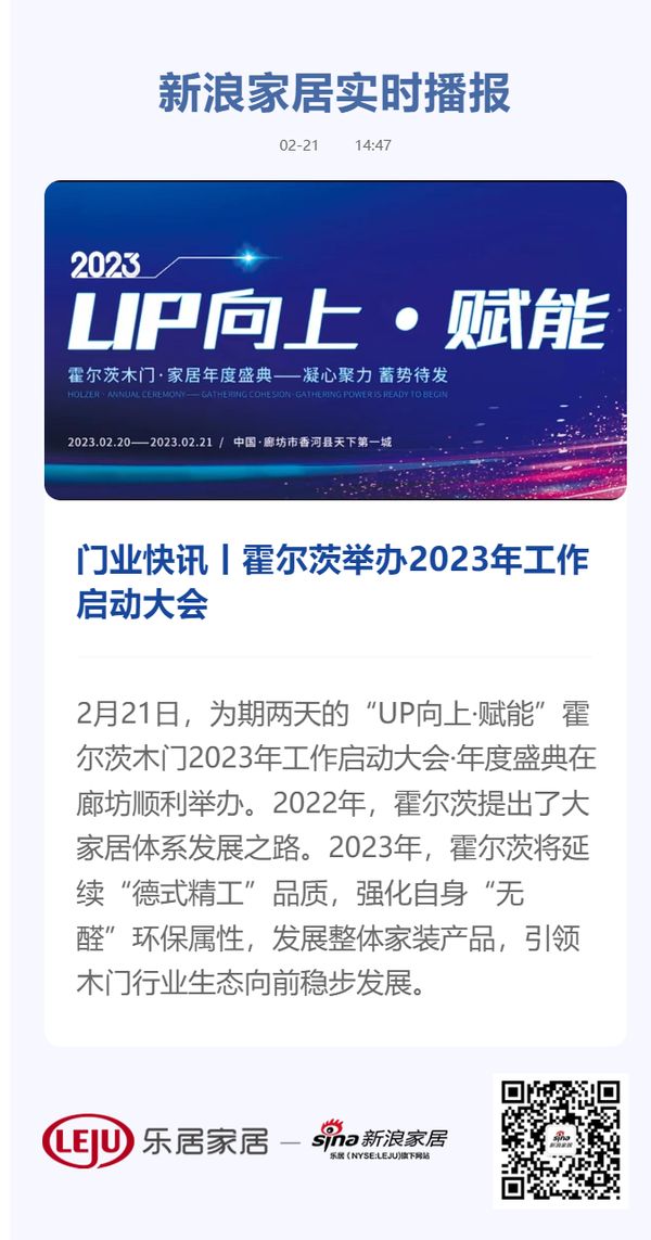 2月21日,为期两天的”UP向上·赋能“霍尔茨木门2023年工作启动大会 · 年度盛典在廊坊顺利举办。2022年,霍尔茨提出了大家居体系发展之路。2023年,霍尔茨将延续”德式精工“品质,强化自身”无醛“环保属性,发展整体家装产品,引领木门行业生态向前稳步发展。