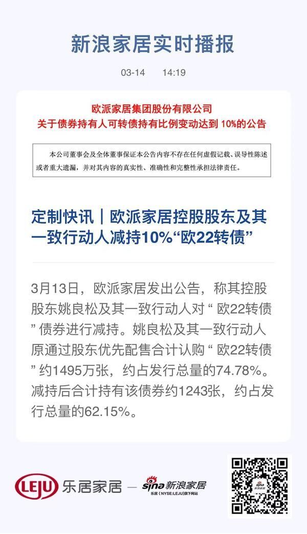新浪家居定制频道讯 3月13日,欧派家居发出公告,称其控股股东姚良松及其一致行动人对“欧22转债”债券进行减持。姚良松及其一致行动人原通过股东优先配售合计认购“欧22转债”约1495万张,约占发行总量的74.78%。减持后合计持有该债券约1243张,约占发行总量的62.15%。