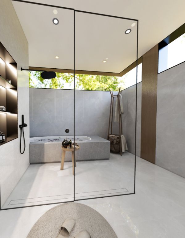 卡士灰,色调柔和,搭配白色纹理细腻而不规则。温润的质感、柔和的色彩,使其成为优雅卫浴间的绝佳搭配。半开放式结构设计给予卫生间更加宽敞明亮的室内环境。