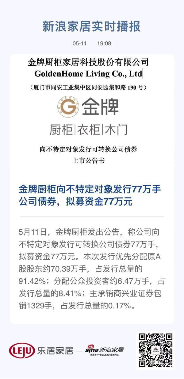 5月11日,金牌厨柜发出公告,称公司向不特定对象发行可转换公司债券77万手,拟募资金77万元。本次发行优先分配原A股股东约70.39万手,占发行总量的91.42%;分配公众投资者约6.47万手,占发行总量的8.41%;主承销商兴业证券包销1329手,占发行总量的0.17%。
