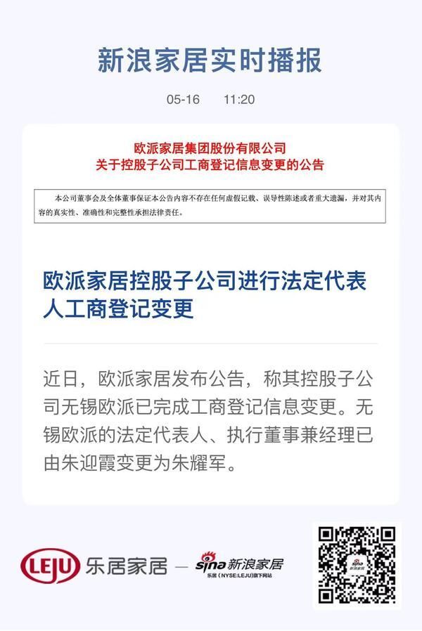 近日,欧派家居发布公告,称其控股子公司无锡欧派已完成工商登记信息变更。无锡欧派的法定代表人、执行董事兼经理已由朱迎霞变更为朱耀军。