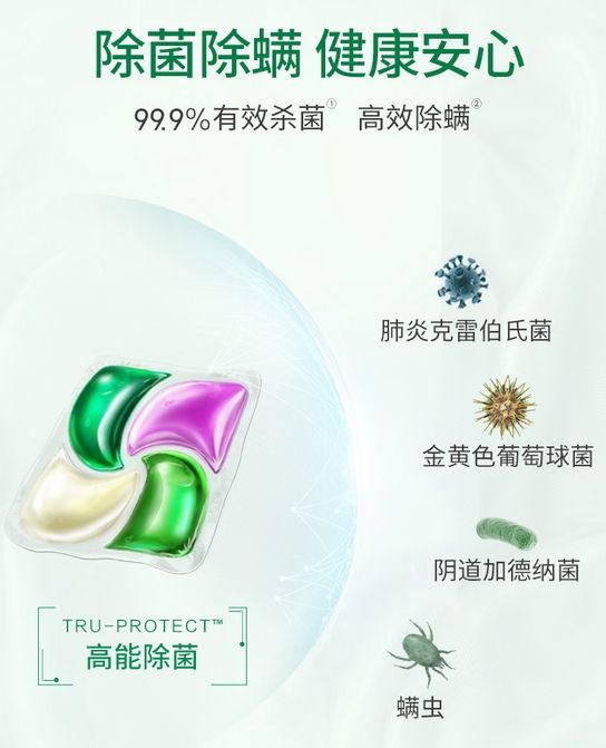 不光是便捷性,洗衣凝珠的功效也要更强于其他产品,滴露洗衣凝珠有8倍深层洁净力,有天然去渍素,优质可降解,洗衣凝珠里的活性物可以快速分解衣服上的污渍,深入衣物纤维层,一层一层往里剥,不放过一点污渍,高效去污。还有99.9%杀菌效果,消灭金黄色葡萄球菌、肺炎克雷伯氏菌、阴道加德纳菌、痤疮丙酸杆菌等等都不在话下,还能达到72小时有效抑菌,这个是常规洗衣液无法做到的,也是滴露洗衣凝珠的核心竞争力之一。