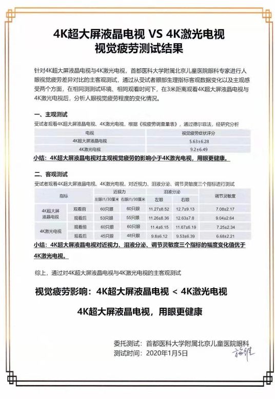 首都医科大学附属北京儿童医院眼科曾就4K超大屏液晶电视和4K激光电视进行过视觉疲劳测试,经过专业医生团队的实测显示,相比于激光电视,液晶电视的表现似乎是要更为“护眼”的存在。此次实测也再次引发了关于激光电视“护眼问题”的讨论,究竟是创新技术、还是营销噱头,想必也是仁者见仁、智者见智。
