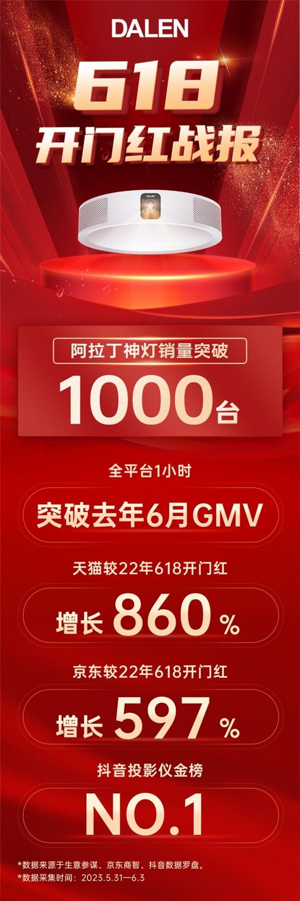 据达伦光科技后台数据显示,618开门红开局仅1分钟,突破22年618开门红全时段总销售额;开门红期间,达伦天猫同比增长860%,京东同比增长597%,抖音则一举拿下投影仪热卖金榜TOP1,销量远超第二第三名总和。