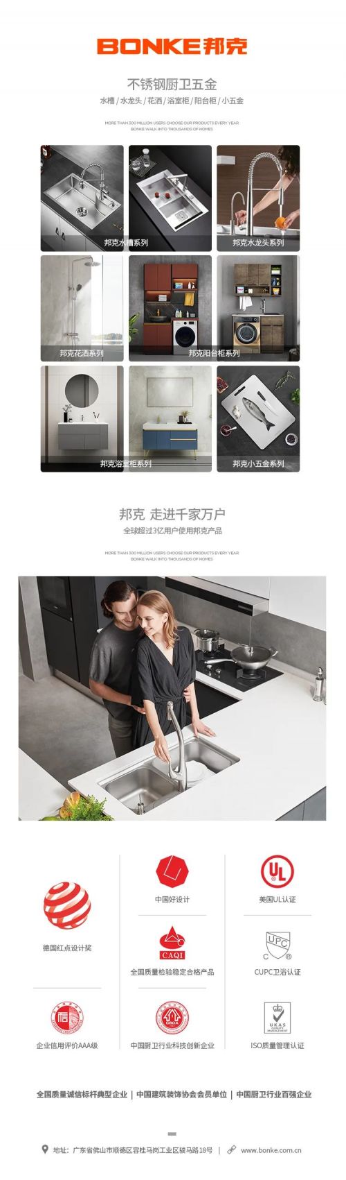 作为人与家居不可或缺的链接点,邦克认为厨卫五金不仅是厨具功能的表达者,它还应该是家居风格的共创者、生活质感的守望者。正是这种信念,二十六年来邦克坚守厨卫五金的品质和创新,用心打造符合消费者高品质生活要求的匠心产品。