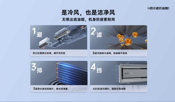 另外防油烟也是消费者所关注的。用户担心冷风吹下来,会不会把油烟带到自己身边,影响油烟排放。奥普的解决方案是采用的冷热分离速冷技术,通过优化夹层热风与室内冷气的流动,确保快速制冷的同时保持室内环境的舒适与纯净。在应对油烟方面,则是采用4防8滤油烟技术,通过多重防护和多层过滤系统,有效阻隔油烟进入机身,提高了机身的防腐耐用性,延长了产品的使用寿命。对用户而言,出风经过层层过滤。吹出来的就是洁净冷风。