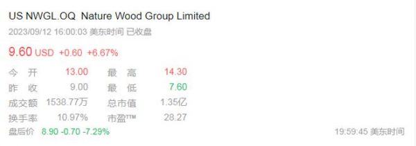美国东部时间2023年9月12日,全球领先的垂直整合林业公司大自然林业在纳斯达克成功上市,股票代码“NWGL”。截至当日收盘,大自然林业总市值为1.35亿美元。