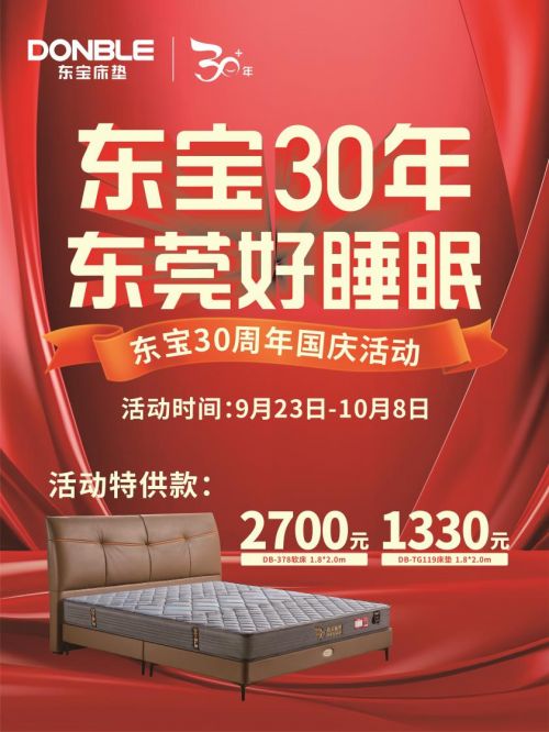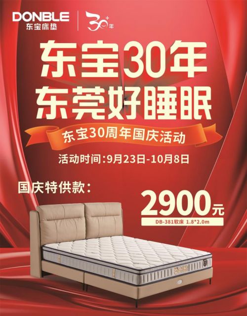 东宝床垫30周年国庆节献礼2023年是东宝床垫创立30周年,恰逢中秋、国庆双节,为庆祝这一盛事,东宝床垫将于9月23日-10月8日举办国庆活动。