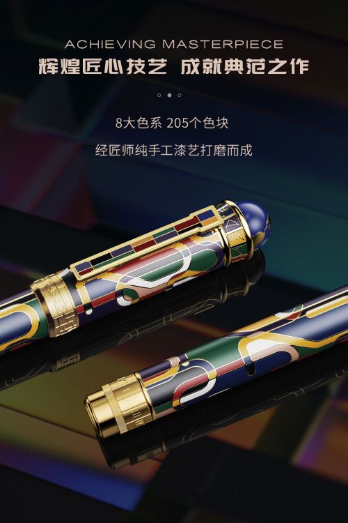 毕加索钢笔的至臻工艺成就辉煌系列的艺术魅力与温度。整只笔身有八大色系205个色块,均由匠师纯手工漆艺打磨完成,弘扬传承了非遗文化和大国工匠精神,其历久弥新的色彩,艺术奢华的质感,使辉煌系列不仅仅只是一款书写工具,更是一件值得收藏的艺术品。