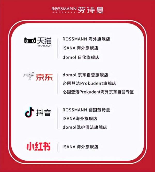 除此以外,品牌也在京东、抖音及红书等国内主流平台上开设官方店铺,分别是ROSSmANN海外旗舰店(抖音)、ISANA海外旗舰店(抖音及红书)和domol洗护清洁旗舰店(抖音)以及两家京东自营旗舰店(Prokudent/domol自营旗舰店)。同时为了进一步扩大中国市场,品牌也与阿里巴巴手淘方达成了密切的合作,不仅天猫超市可以购买到原装正品,天猫国际直营也已入驻三个品牌分别是:domol 、ISANA以及 altapharma(保健)。