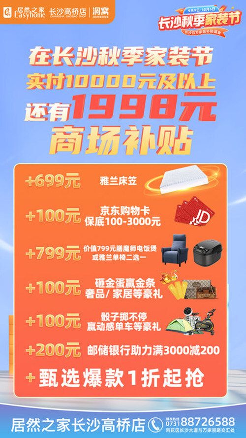 金秋十月,正值装修好时节,一年一度的国庆黄金周到了,很多装友就在问,国庆期间长沙各大家居卖场、品牌门店有什么优惠活动?不用到处奔波,搜遍全城为你搜罗最优惠信息,让你装修“巨省钱”!