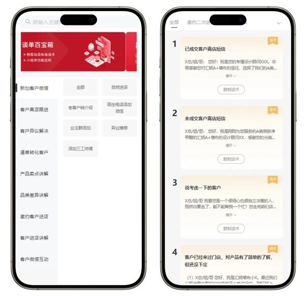 同时,V2.0智能服务系统整合了荷兰蔻帝商学社的优质内容,建立了统一的端口,让店员能够轻松获取案例和标准话术。案例和话术都是根据不同场景和需求进行分类和整理,可以让店员在服务过程中更加得心应手,提高签单率。