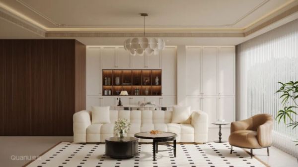 采用拱形门洞搭配曲线造型家具,柔化空间线条,打破方正空间的呆板感,让整体氛围更加优雅柔和。