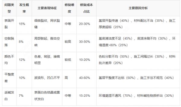 A:根据行业数据,约15-25%的微水泥工程会出现不同程度的问题,但其中85%以上可通过专业修复解决。主要问题包括开裂(15%)、空鼓(8%)、色差(12%)等,这些问题多源于基层处理不当(占比70%),而非材料本身质量问题。